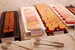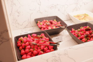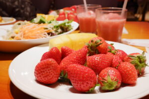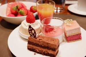 ビュッフェ台は圧巻でした。グラスや小皿に盛られていて見栄えのするものが多かったです。取りやすいのも良かったですね。フレッシュ苺コーナーがあり、3品種を食べ比べできました。これも嬉しかったです。