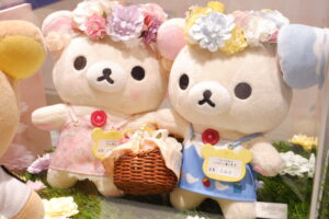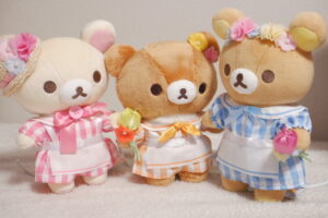 今回はエプロンワンピースとお花がテーマのぬいぐるみを家族に頼まれて購入してきました。ピンクのコリラックマ、オレンジのこぐまちゃんが有楽町の限定品、青のリラックマは東京駅のお品です。