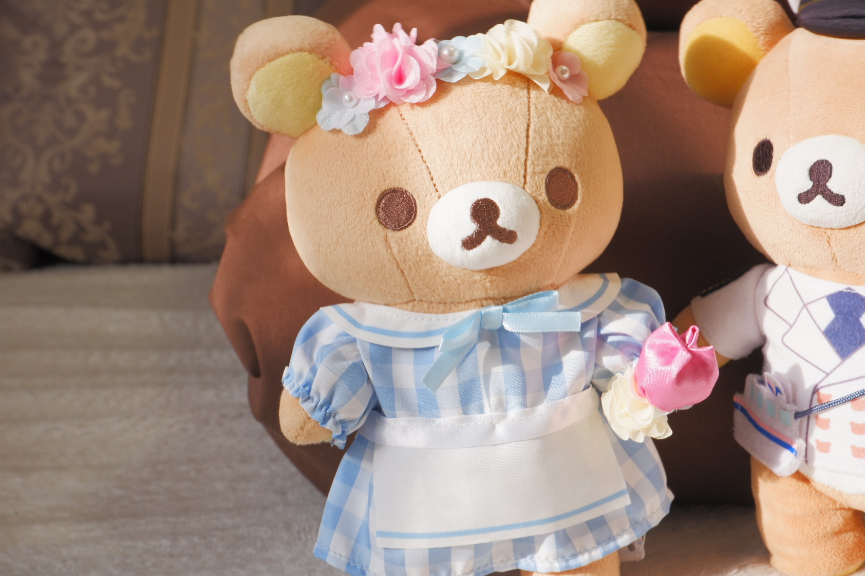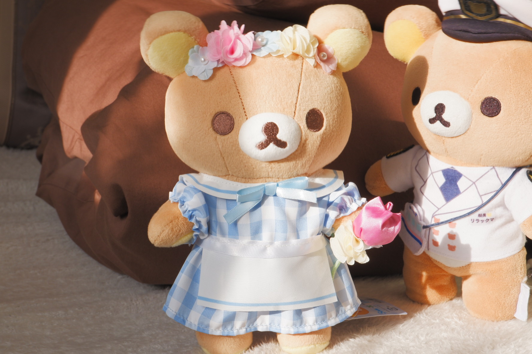 今回はエプロンワンピースとお花がテーマのぬいぐるみを家族に頼まれて購入してきました。ピンクのコリラックマ、オレンジのこぐまちゃんが有楽町の限定品、青のリラックマは東京駅のお品です。